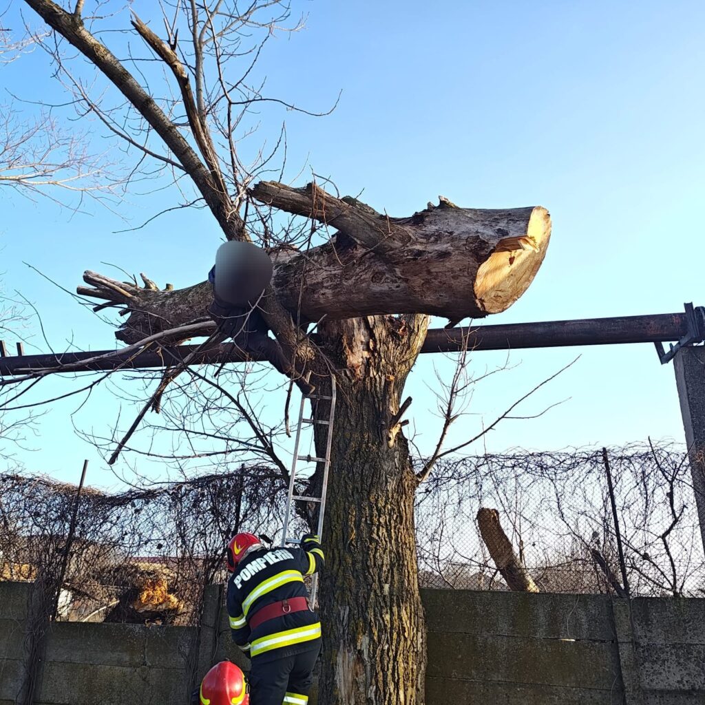 Un tânăr de 22 de ani a rămas captiv la înălțime, sub greutatea unui trunchi de copac pe care îl tăia.