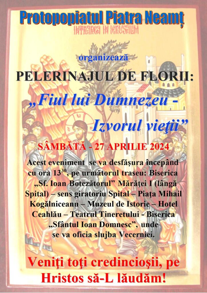 Protopopiatul Piatra Neam organizează sâmbătă, 27 aprilie 2024, începând cu ora 13.30, PELERINAJUL DE FLORII: „Fiul lui Dumnezeu, Izvorul Vieții”.